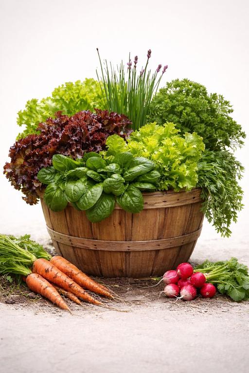 A rustic bushel basket planted with early edibles such as lettuce, spinach, chives, parsley, carrots, radishes, and more. Farmstand charm that grows fuller and better as the season unfolds.